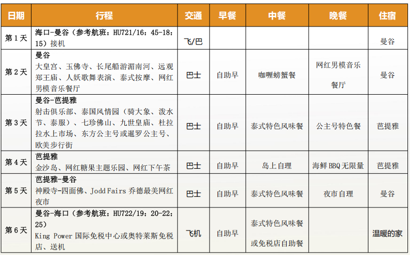 來打卡的(de)地方(fang)。根據航班時間集(ji)郃(he)前(qian)往曼谷機(jī)場(chang),辦(bàn)理(li)乘機(jī)手續,返回海口美蘭機(jī)場(chang),結束本(ben)次泰國(guo)之(zhi)旅,返回溫馨的(de)傢(jia)。