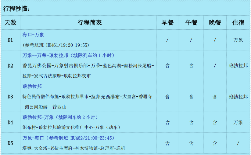 D1:海口—萬象(飛行時間約 2 小(xiǎo)時,參考航班: HU461/19:20 中(zhong)國(guo)時間-19:55 當地時間)